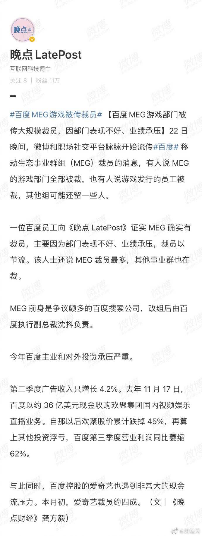 22 日晚间,微博和职场社交平台脉脉开始流传#百度# 移动生态事业群组(MEG)裁员的消息,有人说 MEG 的游戏部门全部被裁,也有人说游戏发行的员工被裁,其他组可能还留一些人。一位百度员工向@晚点LatePost 证实 MEG 确实有裁员,主要因为部门表现不好、业绩承压,裁员以节流。该人士还说 MEG 裁员最多,其他事业群也在裁。