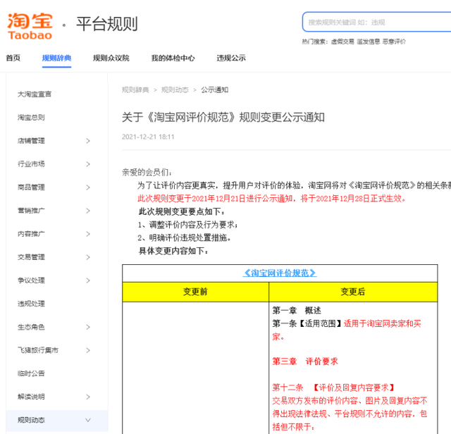 据了解,本次规范调整将以提升评价内容真实性,规则变更将于2021年12月28日正式生效。
