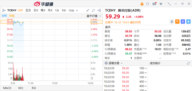 智通财经APP获悉,12月23日(周四),腾讯ADR(TCEHY)股价走高,截至发稿,该股涨超4%,报59.25美元。此前腾讯公布以实物分派京东A类普通股的方式宣派中期股息。派发完成后,腾讯持有京东股份占比将从17%降至2.3%,腾讯总裁刘炽平也将卸任京东董事。