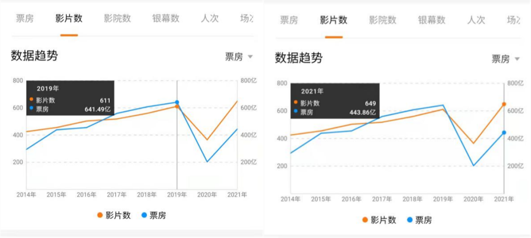 那就得看今年的上映片数,可以看到,2019年的影片数是611部,而2021年为649部,也就是说“蛋糕”(票房)小了,但要分蛋糕的“刀”(电影)多了。
