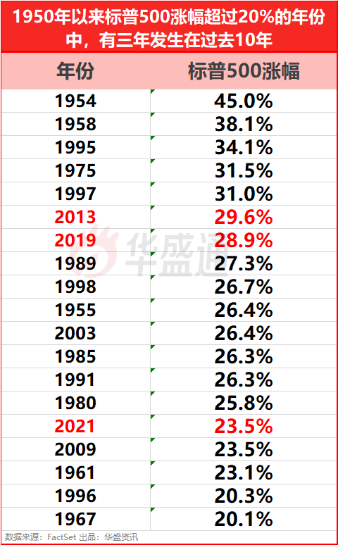 CFRA策略师Sam Stovall研究了二战以来的数据,标普500指数从二战以来的平均涨幅为10.4%。标普500指数自1950年以来表现最好的10年里,有2年发生在过去10年,标普500指数在2013年上升29.6%,排在第6位,在2019年上升28.9%,排在第7位。