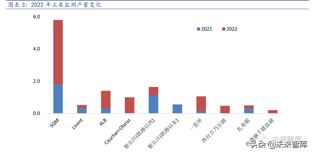 国内察尔汗盐湖(铁路以西矿区) 二期年产 2 万吨碳酸锂产能已经在 2021 年投产, 22 年有望实现满产,给予一定的产量释放量;西藏捌千错盐湖计划 2022 年底建成投产 1 万吨产能,给予 0.2 万吨产量预期;一里坪计划在 2022-2024 年扩产 2-4 万吨碳酸锂, 2022 年产量有近 1 万吨的增量预期;西台吉乃尔湖已经在推进 2 万吨碳酸锂扩能,扎 布耶计划 2022 年产能提升至 1.5 万吨,也各有几千吨的产量增长预期。即便上述项目能够按预期投产,但产量释放存着不确定性,加上盐湖提锂产能释 放周期较长,实际释放量很可能不及预期。