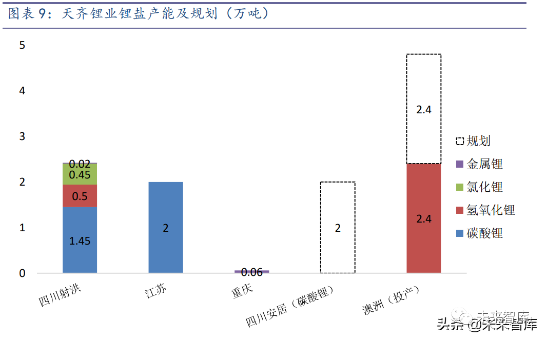 在锂盐板块,公司现阶段主要依托射洪天齐、江苏天齐和重庆天齐提供碳酸锂、 氢氧化锂、氯化锂及金属锂产品,目前公司拥有 3.45 万吨/年碳酸锂产能、0.5 万吨/ 年氢氧化锂产能、0.45 万吨/年氯化锂产能和 0.08 万吨/年金属锂产能,以上产能合计 4.48 万吨/年,预计需要使用的化学级锂精矿约 35 万吨。