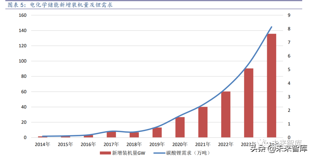 未来储能电池发展将有强有力的需求支撑,随着新能源发电量占比的不断提升、 5G 基站大规模铺开,储能锂电池需求将继续增长,储能领域对锂电池需求的带动值得 关注。预计 2022-2025 年,储能装机量增速在 50%以上,到 2025 年,对应碳酸锂需求 达到 8.1 万吨。