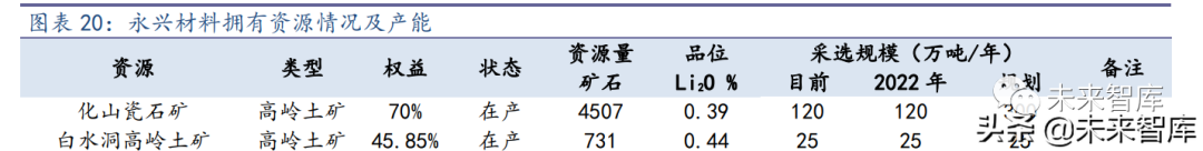 公司 120 万吨/年锂 矿石高效选矿与综合利用项目达产,加之永诚锂业选矿技改项目完成,公司现有年选 矿产能已达到 170 万吨;计划扩建 180 万吨/年锂矿石高效选矿与综合利用项目,与 之 配套的 300 万吨技改扩建的采矿项目,环评已公示。白水洞高岭土矿累计查明控制的经济资源量矿石量 730.74 万吨,公司已与花锂矿 业签订了《长期合作协议》。