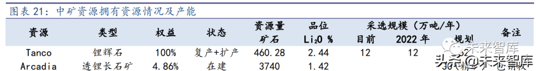 另外,公司参股 PSC 公司持有 Arcadia 锂矿,探明和控制的矿石资源量为 3740 万 吨(Li2O 平均品位 1.42%)。公司已获得 Arcadia 锂矿包销权,包销总量为 28 万吨锂辉 石精矿(氧化锂 6%)和 78.4 万吨透锂长石精矿(氧化锂 4%)。Arcadia 锂矿目前在中 试生产阶段,项目建成后将生产 6%锂辉石精矿 17.3 万吨/年,4%低铁透锂长石锂精矿 化学级 2.4 万吨/年,4%超低铁透锂长石锂精矿技术级 9.8 万吨/年。