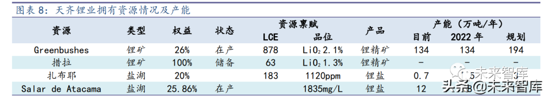 盐湖资源板块,天齐参股全球最大盐湖-Salar de Atacama 拥有者 SQM 的 25.87% 股权,在盐湖板块获得一席之地;国内则参股日喀则扎布耶盐湖 20%的股权。Salar de Atacama 盐湖含锂浓度高、储量大、开采条件成熟且经营成本低,是全球范围内禀赋优 越的盐湖资源和全球锂产品的重要产区,公司碳酸锂的产能从 7 万吨扩产到 12 万吨, 2022 年扩产到 18 万吨;氢氧化锂的产能由 1.35 万吨扩产到 2.15 万吨,并在 2023 年 达到 3 万吨。扎布耶目前拥有产能为一期 0.7-1 万吨,预计 2022 年总产能达到 1.5 万 吨,规划到 2023 年实现 3 万吨。