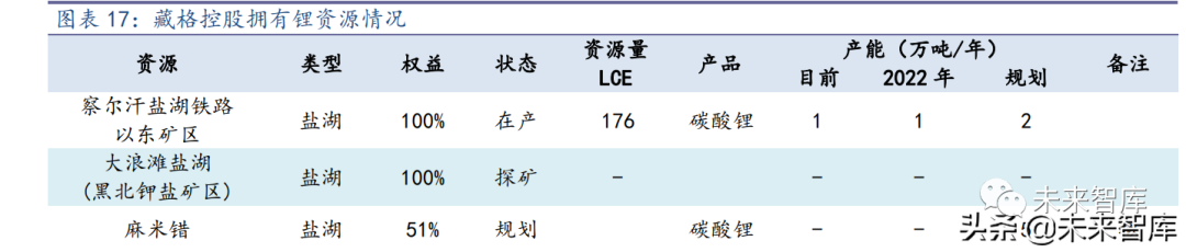 藏格控股是我国第二大钾肥生产企业,拥有 200 万吨氯化钾的年产能。公司于 2017 年 8 月进军新能源产业,成立藏格锂业,拥有察尔汗盐湖铁路以东矿 区 724.35 平方公里的钾盐采矿权证,占察尔汗盐湖开采面积五分之二,该矿区的锂资 源储量为 176 万吨 LCE。公司计划建设年产 2 万吨的碳酸锂项目,其中一期 1 万吨工程 已顺利建成投产,采用吸附法提锂技术,以较低的成本生产工业级碳酸锂。公司在钾 肥的生产过程中,200 万吨钾可以副产 1 亿多吨老卤水。老卤水中的锂离子浓度可达 200mg/L 含量,预计可形成 3-4 万吨的碳酸锂生产能力。
