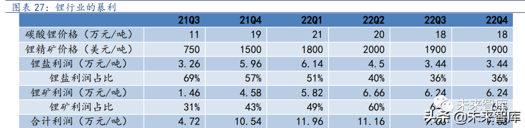 综合而言,供应增量有限叠加需求继续加速,预期 2022 年锂行业整体短缺,考虑 到锂价位于历史高位,利润丰厚,我们判断锂价易涨难跌。经过测算,目前锂产业链利润丰厚,整体处于暴利状态,由于大多上市公司原料 为自有矿或者包销矿,价格低于市场价,未来两个季度锂盐环节利润仍然大于锂矿, 但是利润逐步向锂矿倾斜。