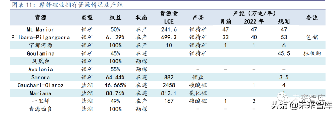 在建矿山有墨西哥 Sonora 锂黏土矿,马里 Goulamina(拟收购 45%股权),前者一 期建设 1.75 万吨 LCE/年,二期再增加 1.75 万吨 LCE/年,计划 2023 年投产;后者的第一期年产能约 45.5 万吨锂辉石精矿,赣锋锂业拟获得 50%包销权,项目首次生产预 计在 2023 年。爱尔兰的 Avalonia、国内的凤凰台都处于勘探和规划阶段,作为未来资源储备。