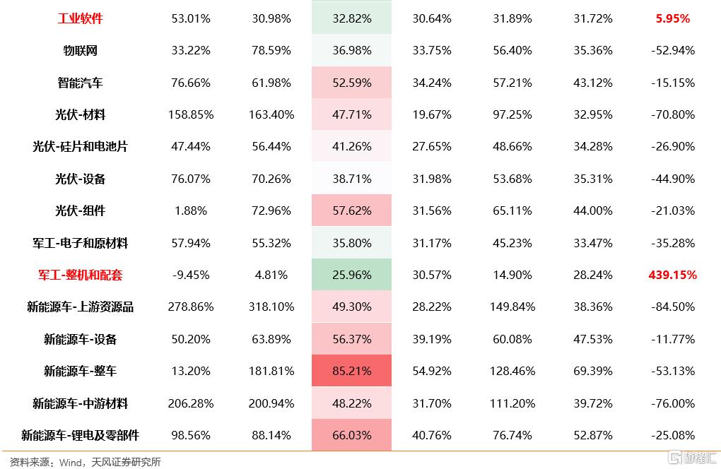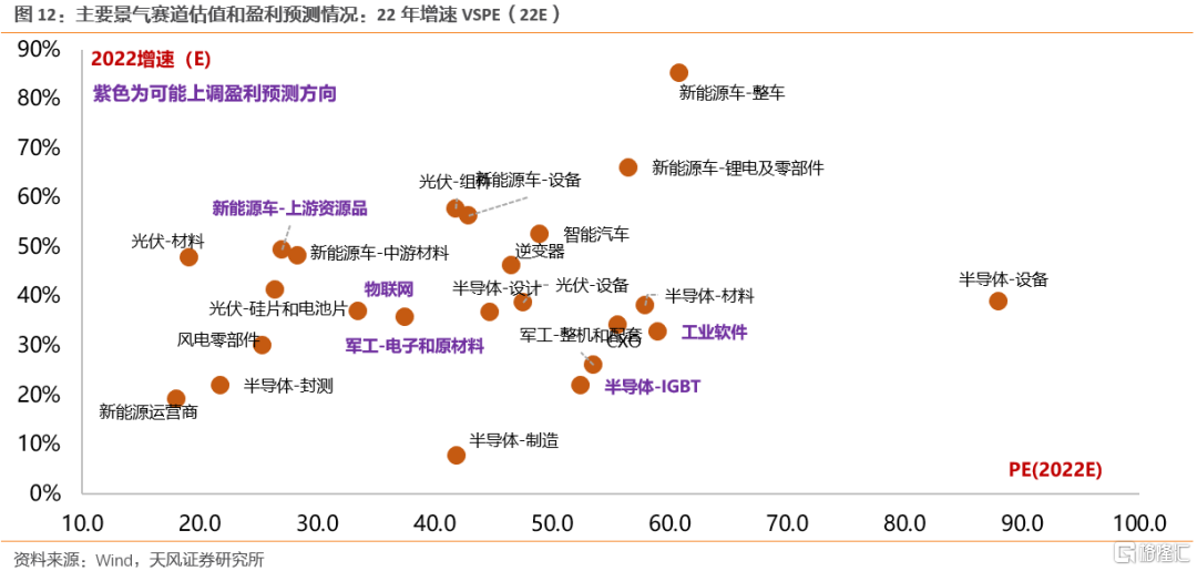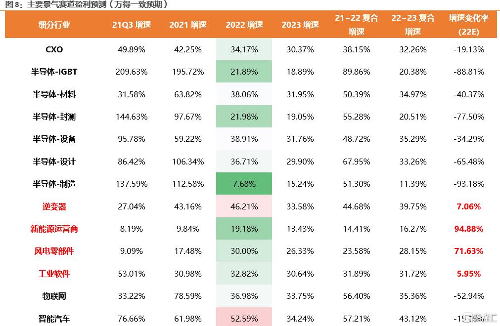 总体来看,在明年A股业绩增速整体回落的情况下,硬科技板块有望继续保持较高的景气度。从细分行业业绩一致预期盈利预测来看,半导体设备、材料、智能汽车以及光伏(设备、组件)、新能源车(设备、锂电及零部件)、军工电子22年增速虽然有所回落,但仍然保持在较高增速(业绩增速30%以上且较21年下滑变化率<50%);相比之下,逆变器、新能源运营商、风电零部件、工业软件、军工整机及配套22年业绩增速较21年进一步提升,除此之外,随着产业周期的推进,物联网也有望进一步上调业绩预期。