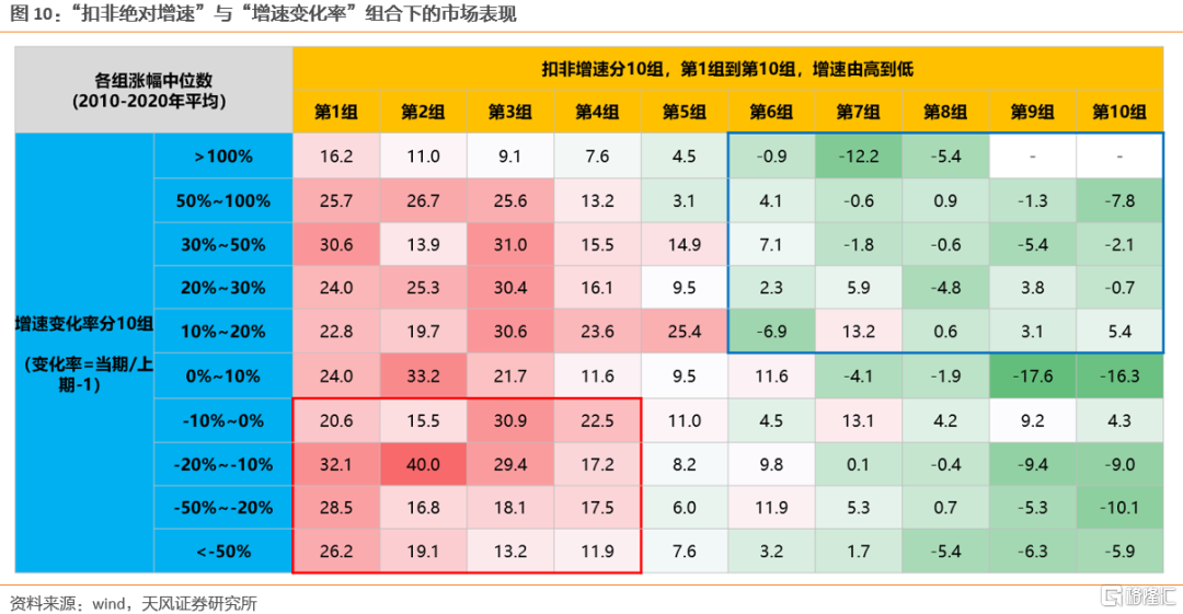 因此,我们将模型进一步展开。下表中横向是全市场所有个股每年的扣非增速(仍然是第1到10组由高到低),纵向代表个股每年的增速变化(从>100%到<-50%共10组),结果显示: