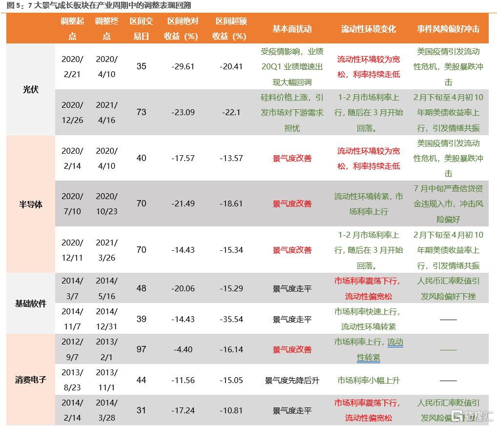 从历史复盘来看,景气成长板块在科技产业周期支撑过程中的阶段性调整持续大概2-3个月,幅度在15%左右。我们在《7大成长赛道复盘:调整的因素、空间、时间——节奏篇》中曾经对有产业周期支撑的7大赛道阶段性调整幅度及时间进行过回顾,光伏、半导体、新能源车、军工电子、基础软件、PCB、消费电子阶段性调整时间普遍在2-3个月(除个别极值以外,大部分调整时间在30-50个交易日,整体均值为50个交易日),区间调整幅度大概在15%-20%。其中,从调整幅度的均值来看,当景气赛道基本面没有出现扰动的时候,整体的调整幅度(-15.34%)会小于基本面出现扰动或者走平时的调整幅度(-20.36%)。