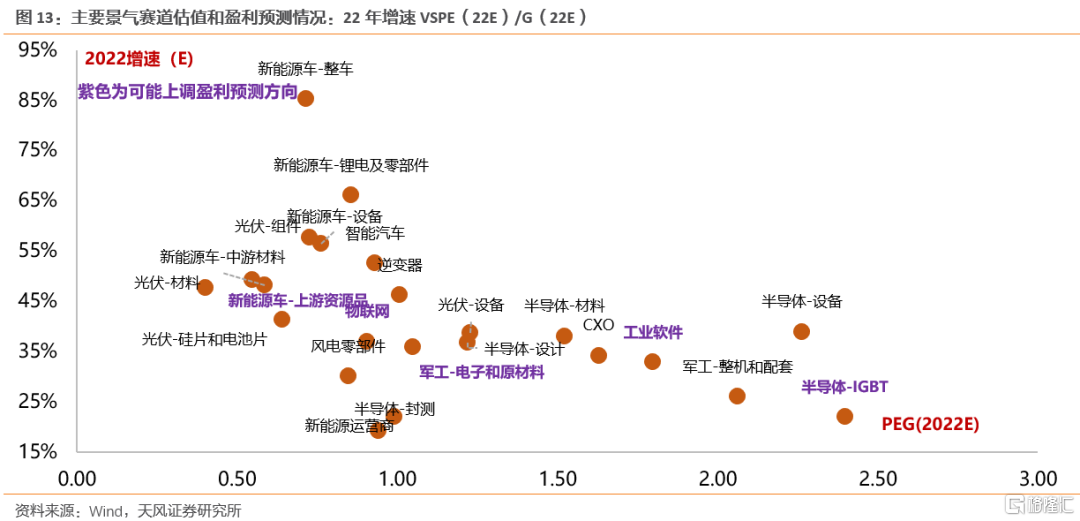 具体方向上,2021年高端制造的板块中,价格大幅上涨是关键词,也是股价的核心驱动,但是展望2022年,价格可能容易出现松动,因此我们更看好纯粹的量的逻辑(没有价格变化驱动),量的逻辑关注:军工、新能源车(电池、零部件、电子、整车)、新能源大基地(风、光、储、运营商)、半导体(设备、材料)。