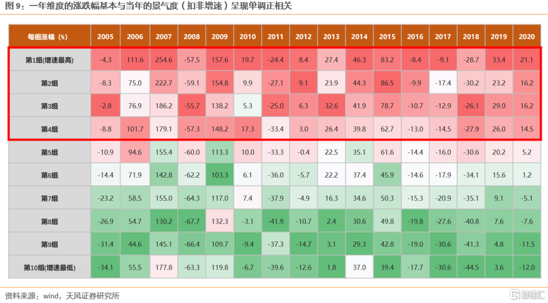 在此前的报告中我们多次展示一个规律:不管市场是牛市、熊市、还是震荡市,不管风格是蓝筹还是成长,也不管板块轮动是快还是慢,一年维度的涨跌幅基本与当年的景气度(扣非增速)呈现单调正相关的情况。