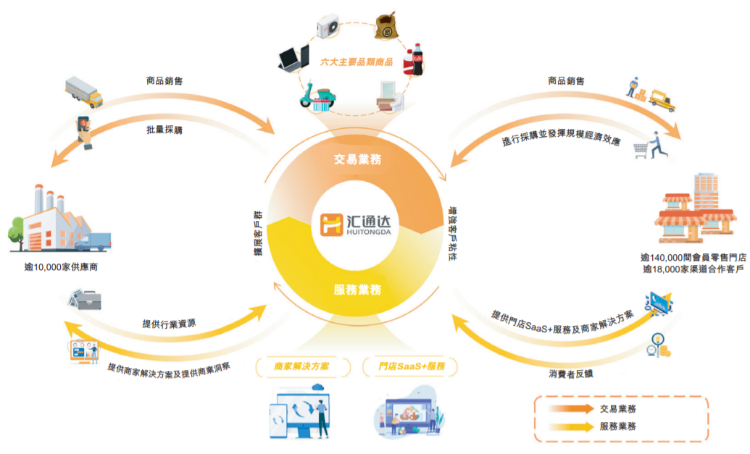 目前,汇通达为客户提供交易业务及服务业务。于交易业务项下,该公司自供应商采购产品(包括家用电器、消费电子产品、农业生产资料、交通出行、家居建材及酒水饮料)并透过自营的汇通达商城网站主要分销往渠道合作客户及会员零售门店。交易业务产生的收入主要包括自营业务模式下的销售收入及在线撮合业务模式下收取的佣金收入及服务费。