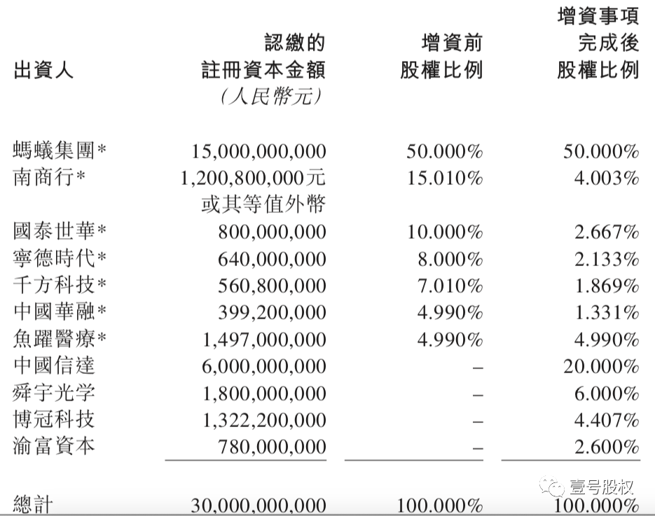 具体为蚂蚁集团认购110亿,占新增注册资本的50%;鱼跃医疗认购10.978亿,占新增注册资本的4.99%;中国信达认购60亿,占新增注册资本的27.27%;舜宇认购18亿元,占新增注册资本的8.18%;博冠科技认购13.222亿,占新增注册资本的6.01%;渝富资本认购7.8亿,占新增注册资本的3.545%。