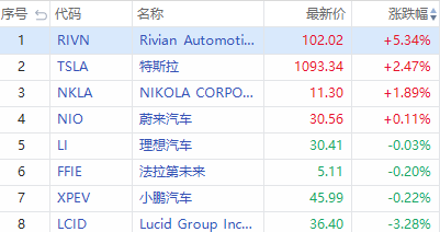 新能源汽车股多数走高,Rivian(RIVN)涨超5%,加拿大皇家银行予Rivian买入评级,目标价165美元;特斯拉(TSLA)盘中涨2.47%,据悉,11月Model 3欧洲销量达10739辆,成为该地区最畅销的电动汽车,马斯克称大量特斯拉汽车将会在年底前交付;NKLA涨超1%,蔚来等跟涨。