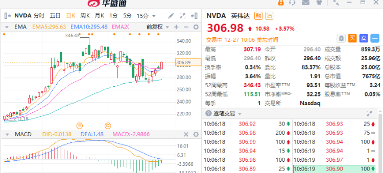 华盛资讯12月27日消息,明星科技股盘初走高,英伟达(NVDA)涨超3%,亚马逊(AMZN)、苹果(AAPL)、微软(MSFT)纷纷跟涨。