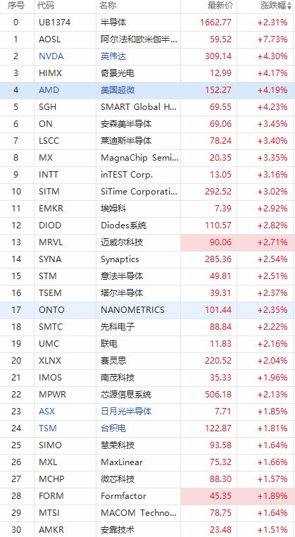 华盛资讯12月27日讯,美股半导体板块拉升,截至发稿,英伟达(NVDA)、AMD(AMD)涨超4%,安森美半导体(ON)涨超3%,迈威尔科技集团(MRVL)涨超2%,台积电(TSM)涨超1%。