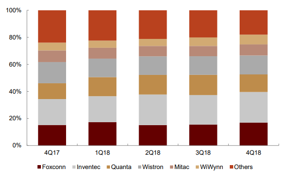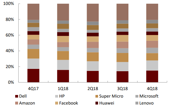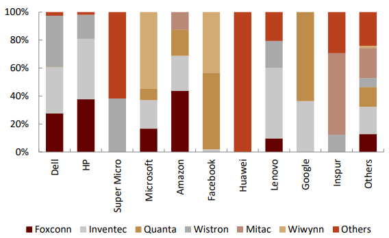 服务器代工市场相对集中,以台系厂商为主。据Digitimes数据,4Q18前十大服务器品牌市场份额占比维持在80%左右,其中戴尔、惠普、亚马逊等头部服务器品牌的代工厂中,台系厂商比例接近100%。我们认为服务器组装业务是推动台系组装厂商增长的主要力量之一,台系组装厂依托PC时代积累的SMT技术、规模生产能力以及客户资源,快速导入服务器行业,市场份额较高。据Digitimes数据,截止4Q18台系服务器组装厂的市场份额超过80%。
