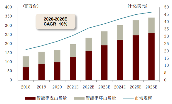 AIoT成为消费电子景气度主要拉动因素,打造组装企业业绩新增长点。5G与AI等技术与新兴的智能硬件产品融合创造了丰富的应用场景和市场空间。在此背景下,智能手表,TWS耳机、VRAR等均实现快速增长。我们预计在2020-2026年智能手表/手环、TWS耳机以及VR/AR出货量复合增长速度将为10%/25%/29%,我们认为,新兴应用的高速成长,将为组装企业打开新利润增长点。