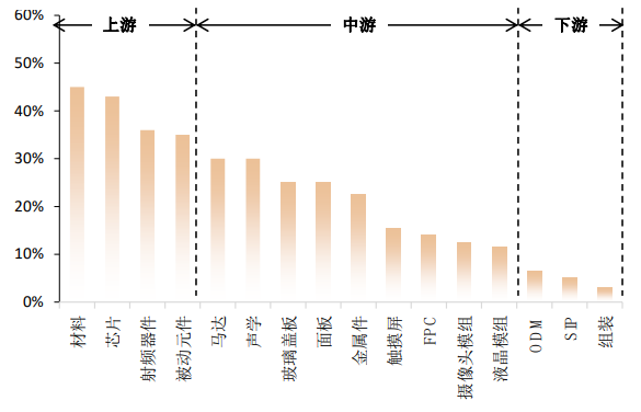 手机供应链中,大陆厂商早期从中游环节切入。手机产业链可以分为上游材料和芯片、中游零组件及下游组装代工环节。大陆厂商早期从马达、声学、玻璃盖板、面板等毛利率较高的零部件切入,目前已在中游零部件环节占据重要地位,电声、结构件及光学等工序已经出现龙头企业。而后大陆厂商通过向产业链下游进行纵向延伸。一方面切入下游组装有利于厂商获取品牌客户的零部件订单,另一方面通过垂直整合可以提升厂商整体利润水平和全方案的竞争力。