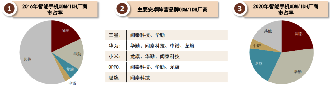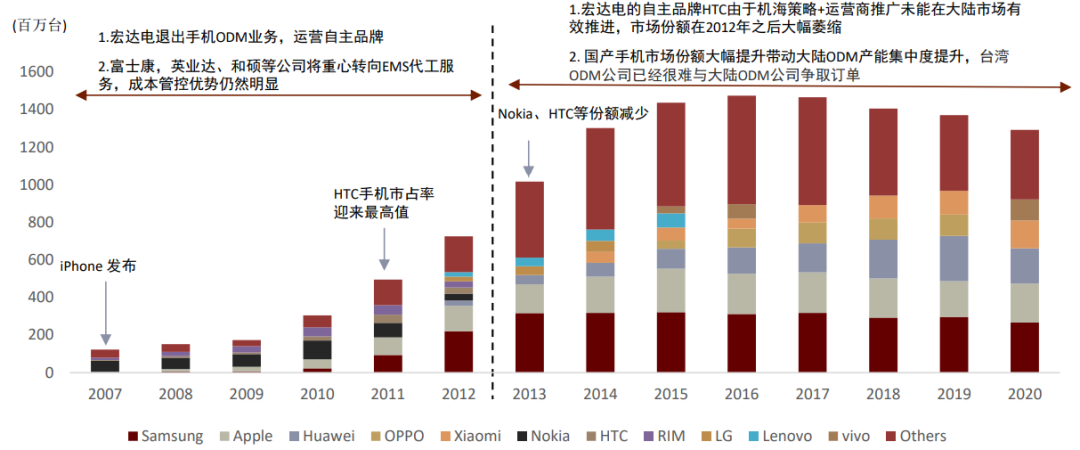 2012年之后,一方面由于中国台湾品牌商HTC在大陆市场未能有效推进,市场份额降低;另一方面由于国产手机品牌的崛起推动国内ODM公司成长,因此手机组装市场份额逐渐向国内头部ODM/EMS厂商龙头集中。