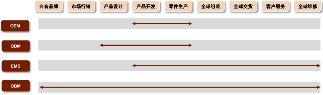 回顾从1995年-2010年的中国台湾组装厂商发展路径,我们看到在过去的组装企业大致遵循两类路线:1)自始至终扮演电子组装代工厂的角色,持续扩张产能和强化规模效应,如仁宝、广达。2)从PC品牌商剥离成为独立组装厂,例如和硕以及纬创。品牌商如宏碁、华硕从主板制造商起步,后发展成为PC合同制造商,承接惠普、戴尔等头部PC品牌商的代工订单,并逐渐延伸至其他电子产品代工,最后跃迁为国际PC品牌商。但考虑下游品牌商削减代工订单压力,上述公司又陆续剥离组装业务,成立独立代工企业以承接母公司及其他下游客户订单。