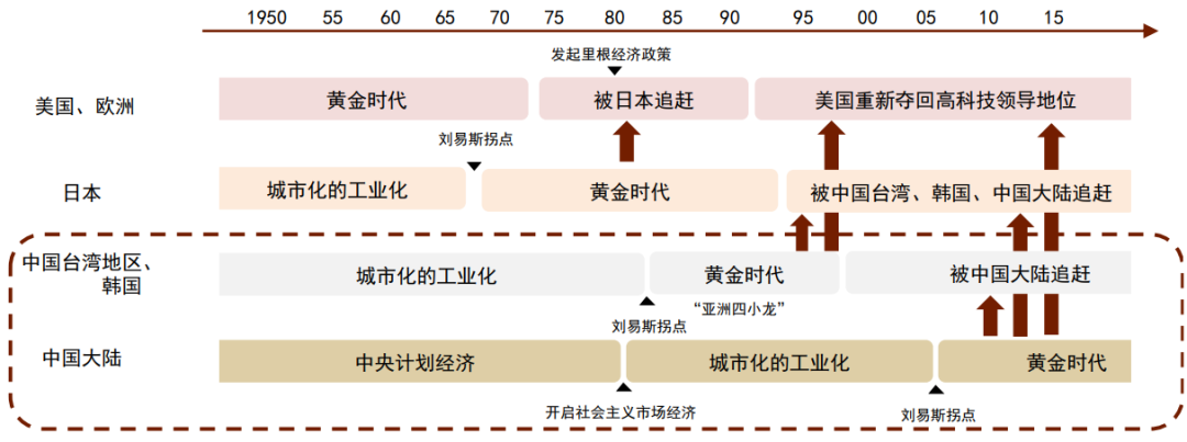 中国台湾地区在2005年工资水平达到高峰,进入被追赶阶段,中国台湾制造企业在此之前已迫于股东要求增加资本收益不变的压力,将产能转移到资本收益率更高的区位如中国大陆地区。