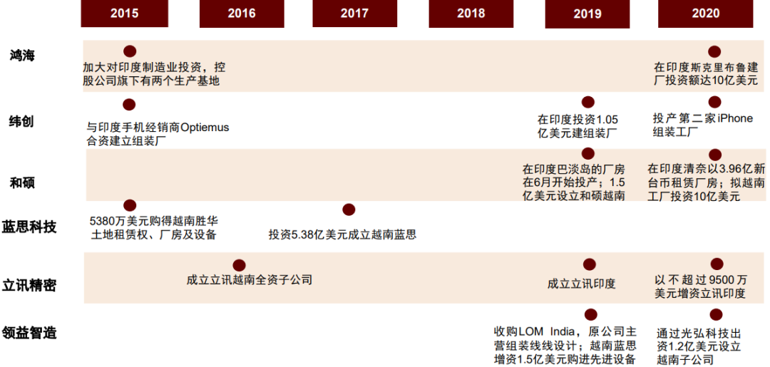 大陆政策红利助推鸿海稳固组装龙头地位。受益于大陆吸引外资的优惠政策和地方性政府支持带来的区域性竞争优势,富士康的生产基地横跨中国大陆珠三角、长三角、环渤海、中西部城市,建成联系紧密的代工网络,并通过并购中小型电子厂和优化内部生产链条(从筛选原材料、采购零部件到最后的产品组装),成功打败大多竞争对手并获得顶级品牌的生产订单。