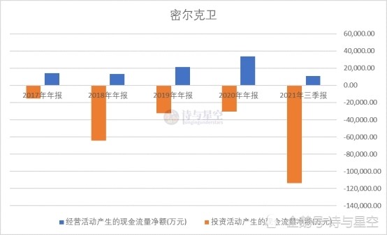 现金流量表显示,公司的投资性现金流量净额的绝对值常年大于经营性现金流量净额,这是星空君做的“简化版”自由现金流对比图,这意味着公司的现金流不够自由,尚未进入真正的现金流驱动的盈利周期。