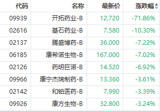 华盛资讯12月28日讯,港股生物医药B类板块普跌,截至发稿,开拓药业-B跌超70%,基石药业-B跌超10%,腾盛博药-B、康希诺生物-B跌超7%。