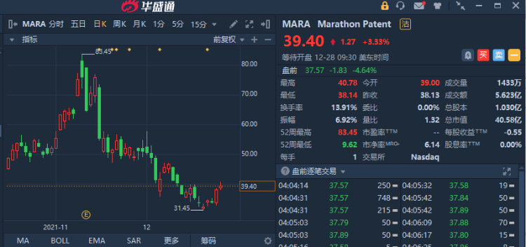 华盛资讯12月28日消息,今日美股盘前,美股区块链概念股盘前走低,Marathon Digital(MARA)跌4.64%,Riot Blockchain(RIOT)跌3.29%,Bit Digital(BTBT)跌3.61%,Coinbase(COIN)跌1.74%。