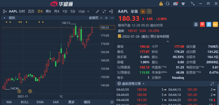 苹果(AAPL)盘前涨近0.4%,市值继续接近3万亿美元。据媒体报道,苹果将于明年推出首款MR头戴装置,售价可能高达3000美元左右,为苹果历来最贵的穿戴装置。
