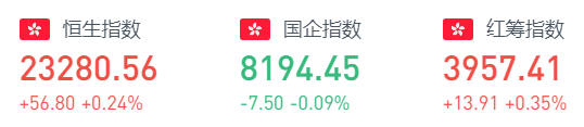 12月28日周二收盘,恒生指数上涨0.24%或56.80点,报23280.56;国企指数微跌0.09%或7.50点,报8194.45;红筹指数上涨0.35%或13.91点,报3957.41。