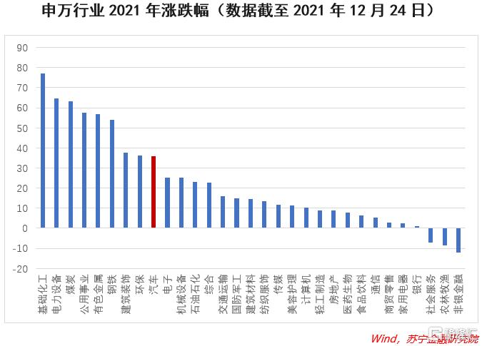 回顾2021年年初至12月24日的行情,汽车行业领先于大盘,涨幅为35.81%,在所有行业中处于领先地位。今年二级市场的表现弱于去年同期,上证指数上涨4.17%,沪深300下跌5.56%。具体来看,中小盘股票表现较好,大盘股表现较差,可以说几乎和去年走出了一波几乎相反的行情,只有新能源保持坚挺。