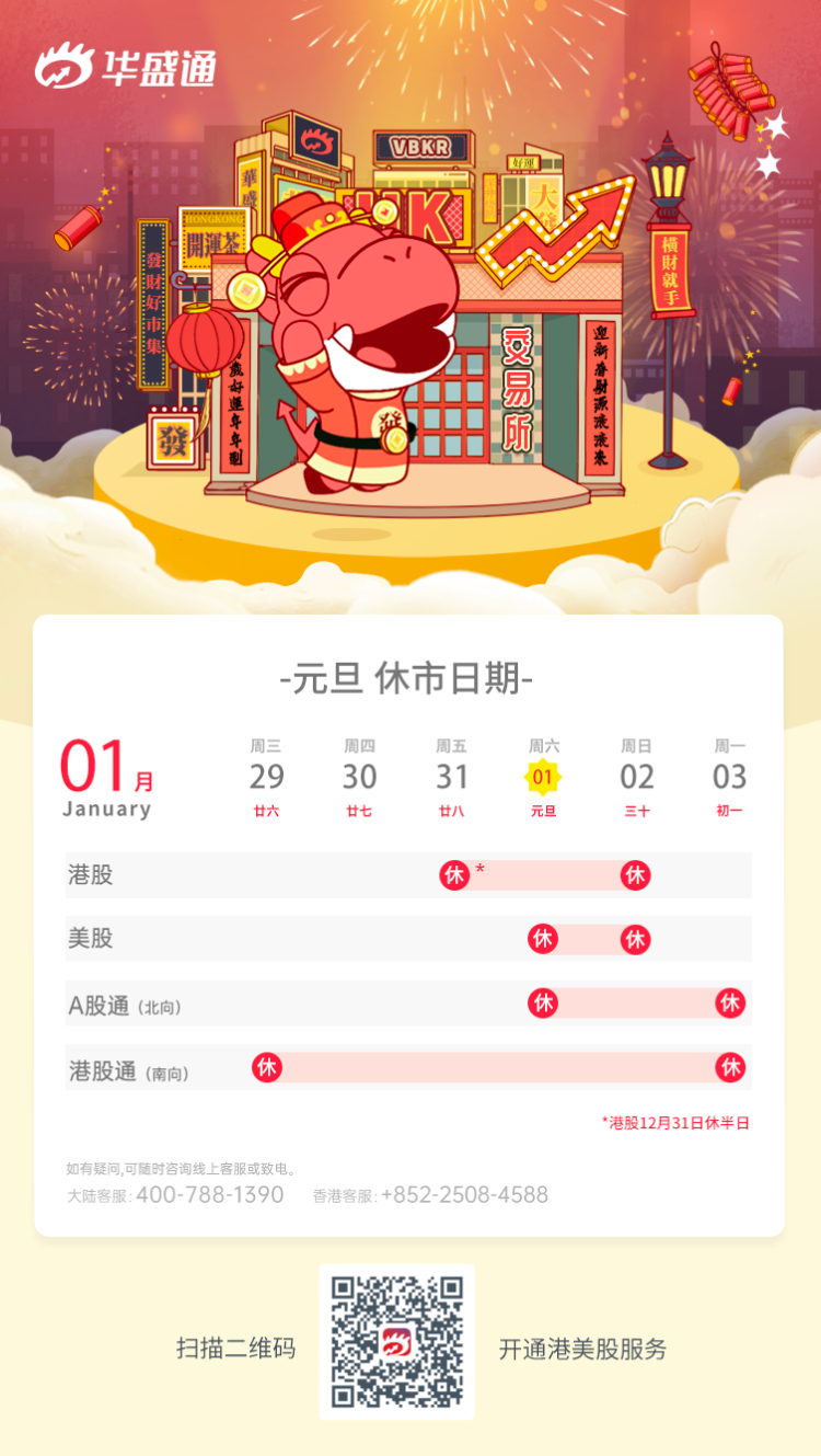 华盛资讯12月29日消息,元旦假期即将来临,港股12月31日(星期五)休市半天,美股正常开市。具体如下: