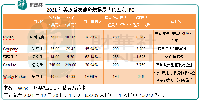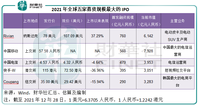2021年全球募资规模最大的五家IPO,分别为Rivian、即将上市的中国移动、中国电信、快手和韩国电商Coupang,中资企业占了三家,显见中资企业依然颇具经济活力。