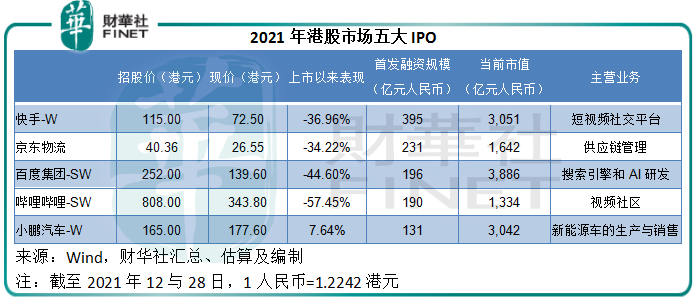 从募资规模来看,今年港股市场最大型的IPO分别为快手-W(01024.HK)、分拆自京东集团(09618.HK)的京东物流(02618.HK),从美股市场回流的百度集团-SW(09888.HK)、哔哩哔哩-SW(09626.HK)和小鹏汽车-W(09868.HK)。但是值得注意的是,除了小鹏汽车因为新能源汽车的概念而得到了市场的嘉奖外,其余的大型互联网科技股表现并不理想,上市以来累计跌幅超34%。