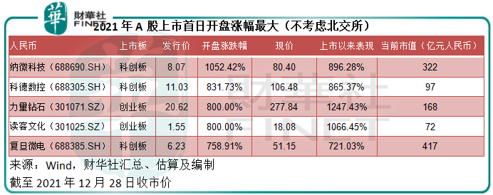 不过,有破发,定然也有表现超群的新股。首日涨幅最大的五只新股是纳微科技(688690.SH)、科德数控(688305.SH)、力量钻石(301071.SZ)、读客文化(301025.SZ)和复旦微电(688385.SZ),开盘涨幅分别达到10.52倍、8.32倍、8倍、8倍和7.59倍,信息科技和半导体占了大部分。