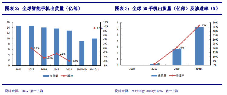 根据IDC数据,2021年全球智能手机出货量预计达到13.8亿台,2022年预计出货14.3亿台,到2025年出货15.5亿台,CAGR为3.9%,或回归低个位数增长态势。未来智能手机增长主要来源于5G渗透率提升,尤其是中国市场以外的地区。