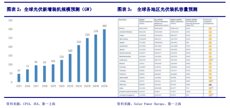 双碳背景下能源转型大势所趋,全球光伏、风电市场规模加速扩大,装机容量占比有望持续快速提升。根据IEA和CPIA预测,至2025年全球光伏新增装机容量将达到300GW。根据 IRENA推算,到2050 年全球光伏累计装机容量将超过8000 GW,其中亚洲将继续主导太阳能光伏的使用,占装机容量的50%以上,其次是北美的20%和欧洲的10%。