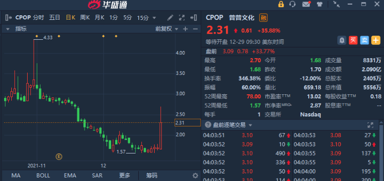 普普文化(CPOP)盘前续涨近34%,该股周二收涨近36%。
