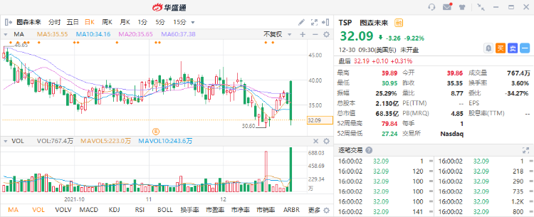- 本周三(12月29日)美股盘前时段,图森未来宣布成功完成全球首次无人驾驶重卡在公开道路的全无人化测试,全程无安全员值守和任何人为干预。受此消息影响,图森未来股价盘前一度冲上40美元,涨逾16%。但在开盘之后,股价迅速回落,最高跌超12%,上演美股“天地板”。