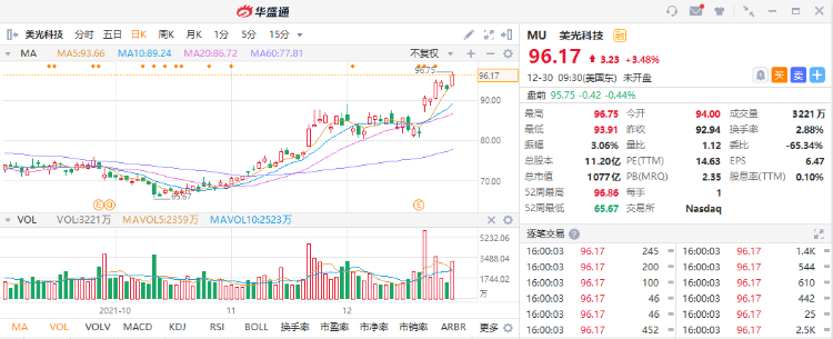 - 美光科技本月以来累计涨幅达14.49%,最新股价报96.17美元,逼近历史最高价96.96美元。美光是全球DRAM和NAND存储芯片龙头,2020年数据显示,DRAM和NAND Flash合计约占存储芯片95%的市场份额。