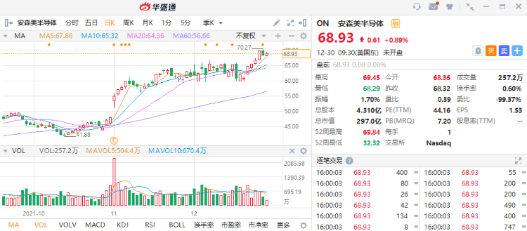- 往期《美股风向标》介绍过多只半导体股,如英伟达 $NVDA 、格芯 $GFS 等。在该板块中,安森美半导体也是近期一只表现不错的半导体概念股。安美森半导体是一家美国半导体供应商,该股本季度累计涨幅达50.6%,最新股价接近其历史新高。