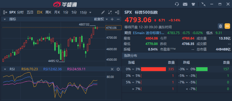 周三标普500指数 $SPX 收盘再创新高,涨幅0.14%,收于4793.06点。该股指上涨使得历史上所谓的“圣诞行情”得以延续。据美国银行 $BAC 的数据,标普500指数自1928年以来有78.5%的时间会在这一时期录得上涨。