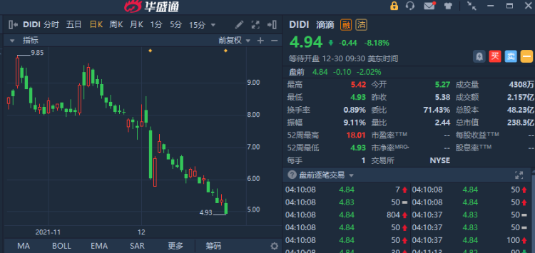 滴滴(DIDI)盘前跌2%,第三季度核心平台总交易额环比下降6.2%至687亿元。