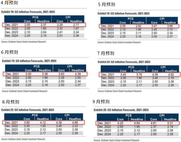 在市场对2021年全年的通胀共识和预期的偏差方面,高盛恐怕最有发言权。该行从4月开始便逐月将消费者物价指数(CPI)和个人消费支出(PCE)预期上调约40个基点,此举一度受到市场奚落。
